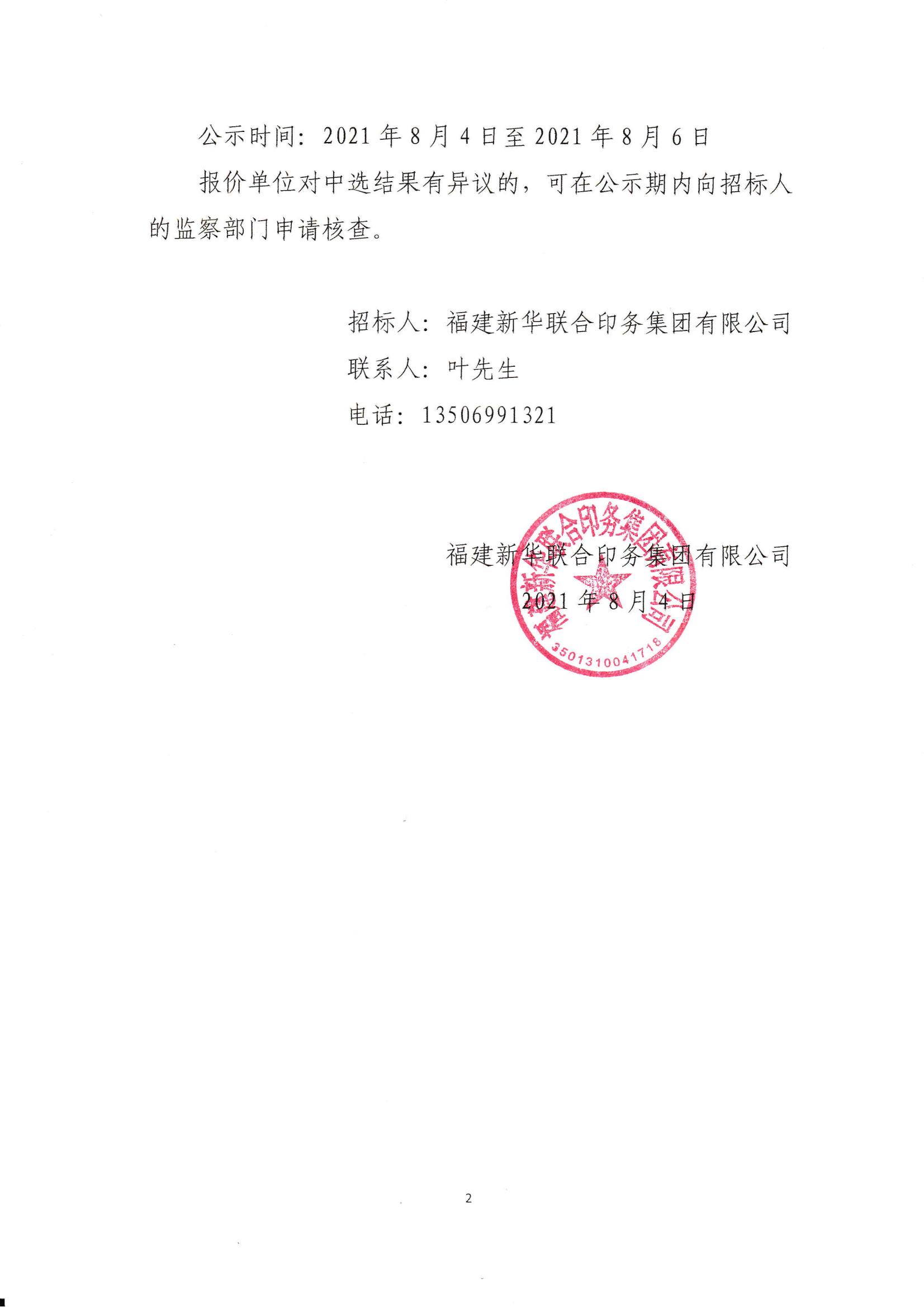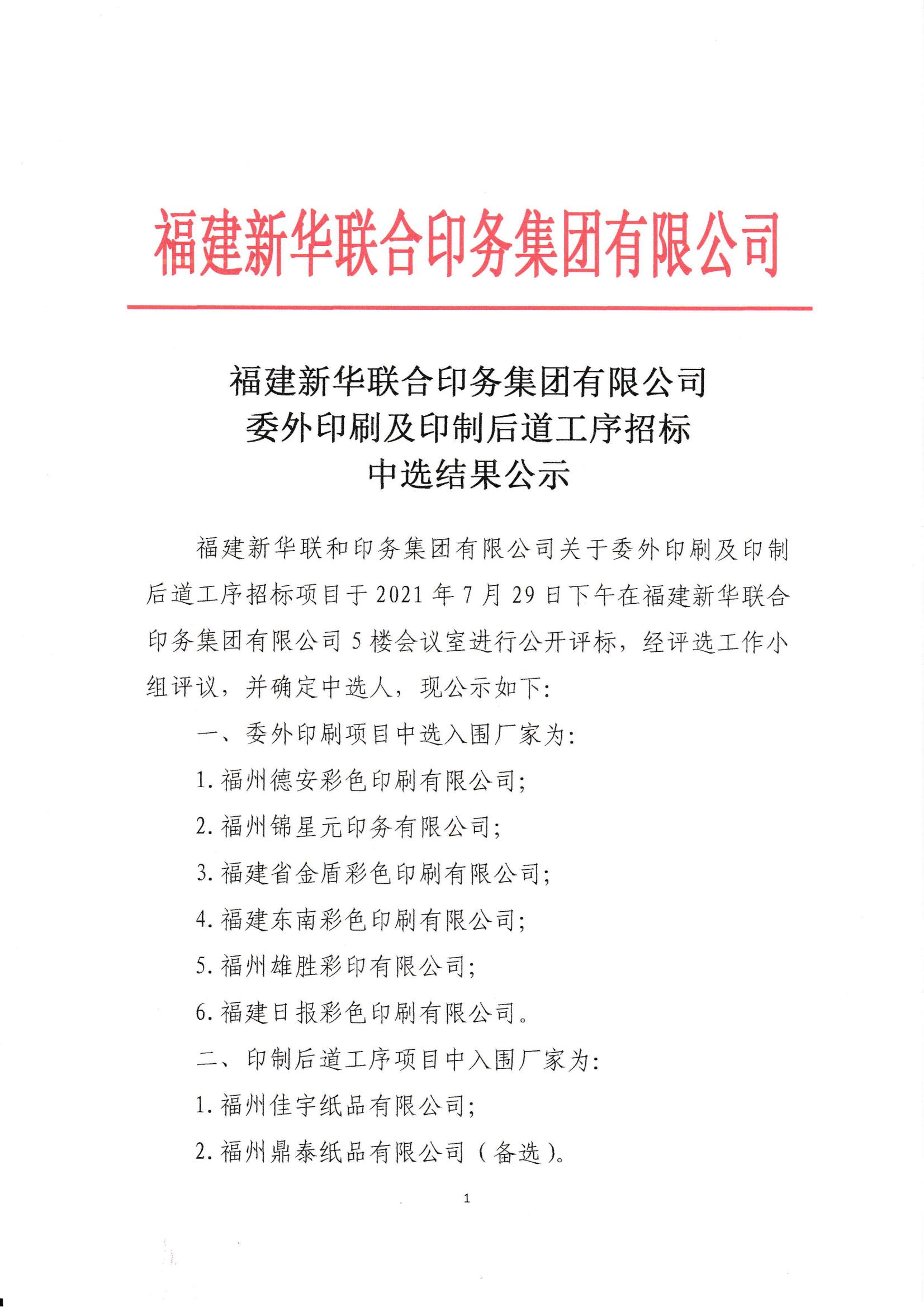 福建(jian)新華聯(lian)合印務(wu)集團有(you)限公司(si)委外印(yin)刷及印(yin)制後🥑️道(dao)工序招(zhao)标中選(xuan)結果公(gong)示